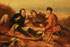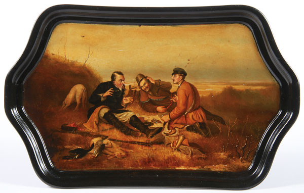 AN INTERESTING RUSSIAN PAINTED BAKELITE TRAY, CIRCA 1925. The shaped tray with rolled edges finely painted with Perov’s “Hunters at Rest”. Verso with raised Cyrillic mark. 12.8 inches x 8 inches (32.7 x 20.5 cm).