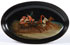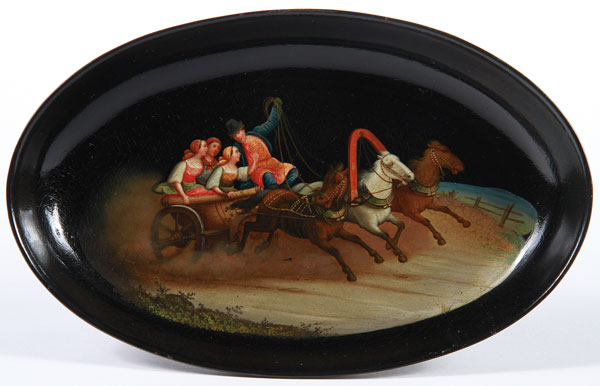 A RUSSIAN LACQUER TRAY, LUKUTIN, 19TH CENTURY. Of recessed oval form finely painted with a summer troika scene on lustre ground and verso with Lukutin mark beneath Imperial Warrant. 7.75 inches x 4.9 inches (9.8 x 12.5 cm).