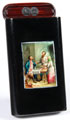 A RUSSIAN LACQUER CIGAR CASE, VISHNIAKOV, 19TH CENTURY. The front inset with mother of pearl and painted with a scene of “Demian’s Fish Soup” after Popov. The underside of hinged lid with Vishniakov mark. 4.75 inches x 2.75 inches (12.2 x 7.1 cm).