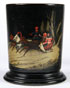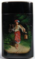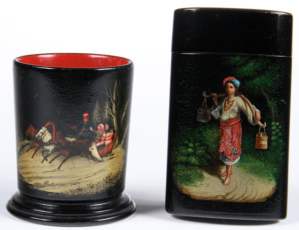 A PAIR OF RUSSIAN LACQUER ITEMS, LUKUTIN, 19TH CENTURY. Comprising a cylindrical pencil holder with stepped base painted with a winter troika scene; and a cigarette or card case with fitted lid painted with a water carrier. Both with Lukutin marks. 4.5 inches x 2.6 inches (11.4 x 6.7 cm) and 2.8 inches x 3.25 inches (7.2 x 8.3 cm).