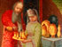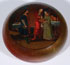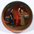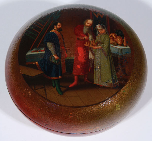 AN INTERESTING RUSSIAN LACQUER COVERED BOX, LUKUTIN, 19TH CENTURY. Of compressed spherical form with ringed foot, the fitted lid painted with an interior Dowery and Boyar scene. Red lacquer interior and with Lukutin marks beneath Imperial Warrant. Diameter 4.5 inches (11.5 cm).