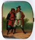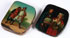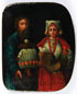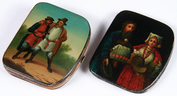 A PAIR OF FINELY PAINTED RUSSIAN LACQUER COIN PURSES, LUKUTIN, 19TH CENTURY. The first painted with a scene of drunken men making merry, the other with a young married couple with symbols of prosperity. The second with Lukutin Factory paper label. 3 inches x 2.5 inches (7.6 x 6.2 cm) and 3 inches x 2.5 inches (7.7 x 6.7 cm).