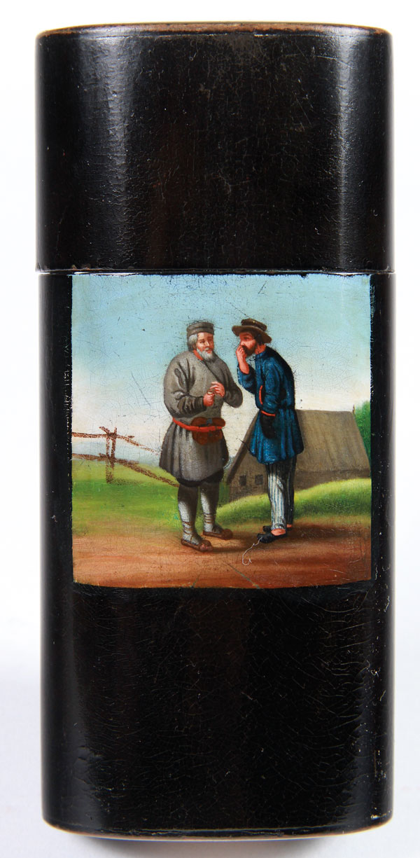A RUSSIAN LACQUER CIGAR BOX, LUKUTIN, 19TH CENTURY. The oval cylindrical form with fitted lid and painted scene of two peasants gossiping. The underside of base set with a Russian silver coin depicting Tsar Nicholas II, and interior with Lukutin mark beneath Imperial Warrant. 5.25 inches (13.2 cm).