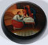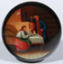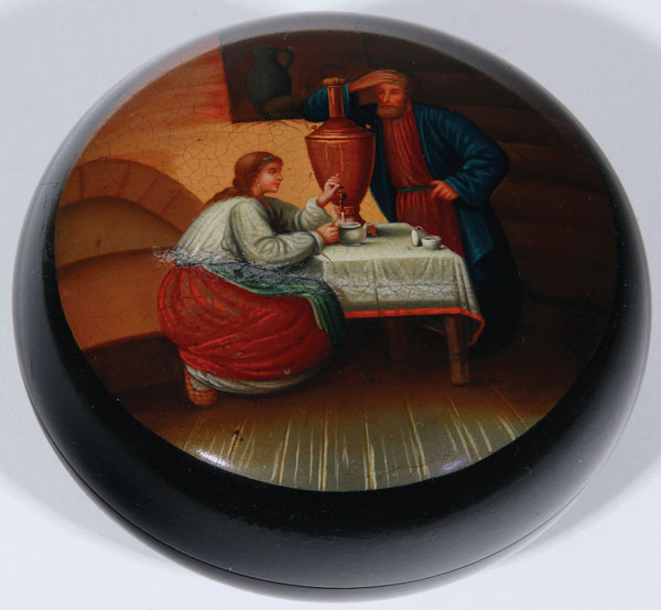 A VERY FINE RUSSIAN LACQUER BOX, LUKUTIN, 19TH CENTURY. Of compressed spherical form with fitted lid and raised ring foot. Finely painted with an interior scene around a samovar. Red lacquered interior with Lukutin mark beneath Imperial Warrants. Diameter 3.9 inches (10 cm).