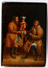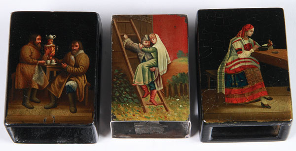 THREE RUSSIAN LACQUER MATCHBOX COVERS. The first of wood and painted with interior scene around samovar; the second on silver with elopement scene hallmarked Moscow 1896-1908 with Cyrillic maker’s mark BEP and 84 silver standard; and a wood example painted with interior dining scene. Greatest length 2.5 inches (6.4 cm).