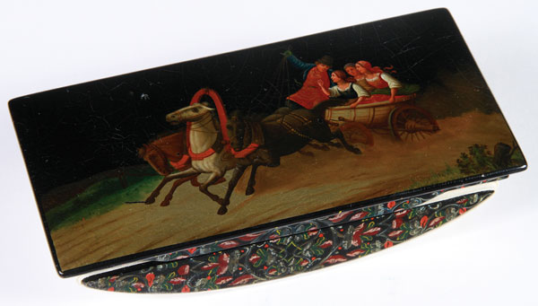 This item was acquired by the consignor from the noted exhibition, “Russian Lacquer Art From Two Centuries”, Museum For Lacquer Art, Münster, Germany, May 11, 1995-January 4, 1996. Furthermore, all of the items were published and many illustrated in the extensive 120 page color exhibition catalog. The Museum of Lacquer Art in Münster, at which these items were exhibited, is still operating in the heart of the city and displays a globally unique collection of lacquer art from East Asia, Europe and the Islamic world with objects from the past two millennia. The museum places an additional main emphasis on research, with publications such as “Russian Lacquer Art From Two Centuries” not only presenting the exhibitions, but leading to new findings in research.
