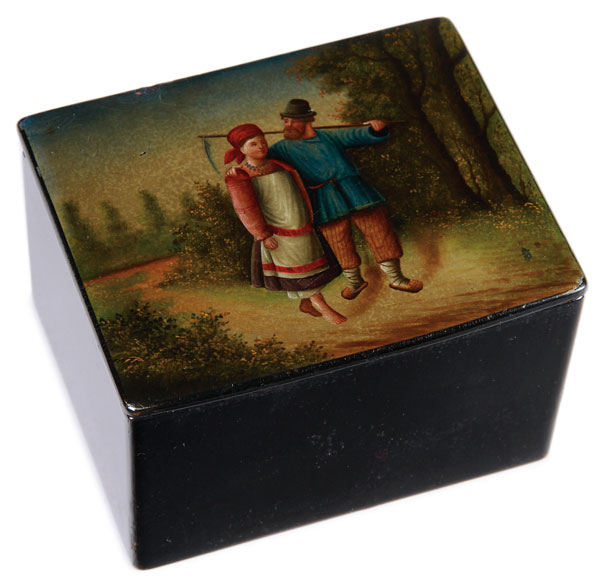 A RUSSIAN LACQUER TEA CADDY, VISHNIAKOV, 19TH CENTURY. The hinged lid painted with a scene of a peasant man and woman returning from the harvest. The interior with fitted lid and Vishniakov marks. Length 4 inches (10.2 cm), width 3.25 inches (8.3 cm), height 2.5 inches (6.6 cm).