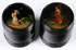 A PAIR OF RUSSIAN LACQUER MATCHBOXES, LUKUTIN, 19TH CENTURY. Of barrel form with ribbed banding, the fitted lids both finely painted with a courting scene and a peasant girl gathering berries and twigs. The underside of both with striking surface. The interiors with Lukutin marks beneath Imperial Warrants. Height 2.5 inches (6.6 cm), diameter 2.25 inches (5.8 cm).