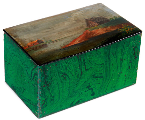 A UNIQUE RUSSIAN LACQUER TEA CADDY, VISHNIAKOV, 19TH CENTURY. The hinged lid painted with a landscape of dachas along a river, and the sides painted in faux malachite. Interior with Vishnakov mark. Length 7 inches (17.8 cm), width 4.3 inches (11.2 cm), height 3.75 inches (9.5 cm).