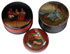 THREE RUSSIAN ROUND LACQUER BOXES, VISHNIAKOV AND LUKUTIN, 19TH CENTURY. Comprising two similar round boxes with ribbed sides, the fitted lids painted with an interior tea drinking scene and an exterior scene of a woman along a shoreline; the third painted with an interior scene of a woman eating. Greatest diameter 2.75 inches (7 cm).