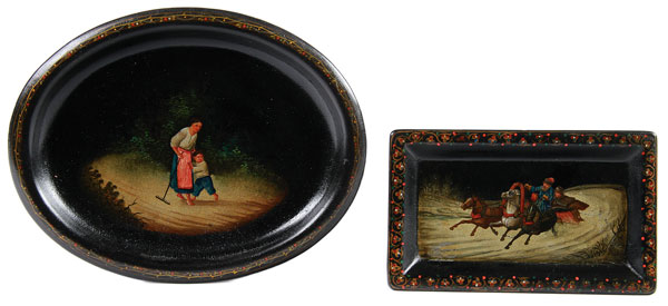 A PAIR OF RUSSIAN LACQUER TRAYS, VISHNIAKOV, 19TH CENTURY. One painted with a peasant woman and her child, the other with winter troika scene. Each marked. Greatest length 8.3 inches (21 cm).