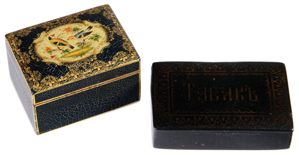 A PAIR OF RUSSIAN LACQUER BOXES, 19TH CENTURY. The first with over-fitting lid painted with song birds, within an ornate gilt framed cartouche, on a blue ground with gilt banding; the second with hinged lid inscribed “Tobacco” in Russian, surrounded by a gilt decorative border. Greatest length 4 inches (10 cm).