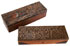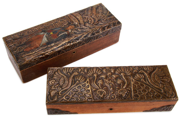 A PAIR OF RUSSIAN ARTS AND CRAFTS WOOD AND BRASS GLOVE BOXES, CIRCA 1890. The first covered with repoussé brass hinged lid depicting stylized birds and flower forms in the Panslavic taste, the front corners similarly decorated. Length 13 inches (33 cm). Together with a similar box with repousséd and polychrome scene of a soldier within a forest beneath artillery pieces and forest in repoussé copper. Length 13.4 inches (34 cm).