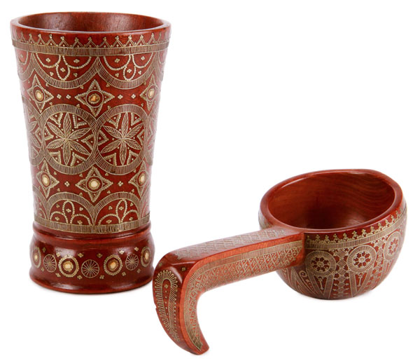 A VERY FINE RUSSIAN WOODEN BEAKER AND KOVSH WITH SILVER AND IVORY INLAY, CIRCA 1900. Of traditional form, the kovsh and beaker inlaid overall in an intricate geometic pattern. The base of the beaker inscribed "Exposition de Bruxilles 24 August 1910". Height of beaker 5.75 inches (15 cm), kovsh length 7.5 inches (19 cm).