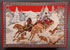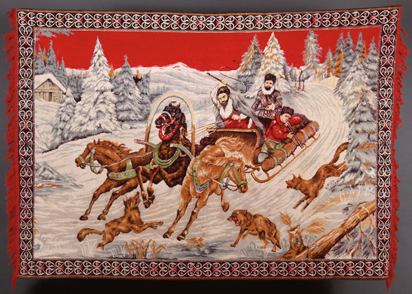 A LARGE RUSSIAN TAPESTRY, FIRST PART OF THE 20TH CENTURY. Finely embroidered with a large winter troika wolf hunting scene on a red ground with decorative border and fringe. Possibly Zavidovsky Manufacturer, Tver. 49.5 inches x 71 inches (126 x 179 cm). (Unillustrated)