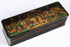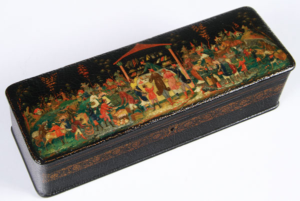 A FINE EARLY RUSSIAN PALEKH LACQUER GLOVE BOX, 1924. Of rectangular form with rounded corners, the hinged lid painted with a complex market scene with various vendors. Artist signed and dated 1924. The sides banded in intricate gold lace design and fitted with latch device. Length 11 inches (28 cm), height 2.8 inches (7.3 cm).