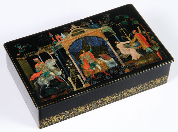 AN EARLY RUSSIAN PALEKH LACQUER BOX, CIRCA 1930. Of rectangular form, the hinged lid exquisitely painted with a fairy tale scene. Trace signature and date lower right. The sides ornately banded in gold lace. Length 7 inches (17.8 cm), width 4.25 inches (11 cm).