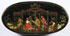 AN EARLY RUSSIAN PALEKH LACQUER BOX, 1928. The oval box with overfitting lid painted with a scene of “At the Loom”. Artist signed and dated Palekh 1928. The sides ornately banded in gold lace. Length 7.5 inches (19 cm).