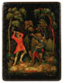 A FINE PAIR OF RUSSIAN LACQUER BOXES, PALEKH, CIRCA 1940. Each of rectangular form with hinged lids, the first painted with a scene from Pushkin’s “The Tsar Sultan”. Artist signed lower right S. Solonian and dated Palekh 1934. The second with a scene of a man being rescued from an attacking bear, artist signed K. Gunaiev and dated 1945. Greatest length 4.25 inches (11 cm).