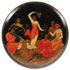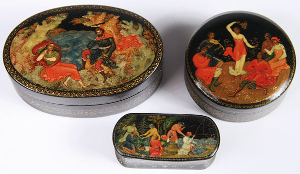 A GROUP OF THREE VERY FINE EARLY RUSSIAN LACQUER BOXES, CIRCA 1925. Comprising a round box with fitted lid painted with peasants making music and dancing. Artist signed D. Butorin and inscribed Palekh dated 1926. Together with an oval box with overfitting lid painted with a reclining woman before a seated knight figure. Artist signed Ivan Bakurov and inscribed Palekh dated 1926. And a small oval shaped snuff box with hinged lid painted with a group of peasants fishing, inscribed Palekh and dated. The sides ornately banded in gold lace. Greatest length 4.3 inches (11 cm).