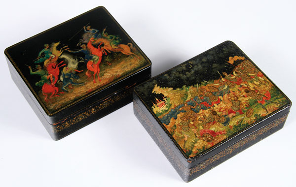 A PAIR OF EARLY RUSSIAN PALEKH LACQUER BOXES, 1929 AND 1930. Of rectangular form, the hinged lids painted with a scene of jousting horsemen, and the other with a battle scene. One signed Buranov, Palekh 1930 and the other inscribed A. Kotokhin and dated 1929. The sides ornately banded with gold lace. Greatest length 5.4 inches (13.8 cm).