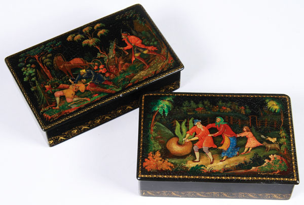 A PAIR OF RUSSIAN LACQUER BOXES, PALEKH, 1930’S. Comprising two rectangular boxes with hinged lids. One painted with a scene illustrating the fairy tale “The Rube”. Artist signed N.Turin and inscribed Palekh 1937. The other painted with a scene of highway men, artist signed S. Bakhirev and inscribed Palekh, dated 1934. The sides beautifully banded in gold lace. Greatest length 5.2 inches (13.2 cm).