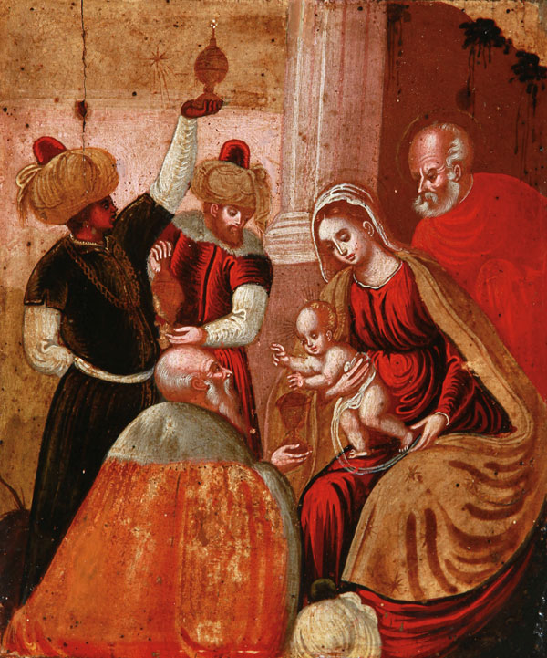 AN ITALO-CRETAN ICON OF THE ADORATION OF THE MAGI, 17TH CENTURY. On the right, the Mother of God cradling the infant Christ who blesses one of the three Magi, kneeling before him with his gift of gold as the other two, shown in the background, raise their gifts in presentation. Behind the Virgin, St. Joseph stands in attendance, and in the upper left, the Star of Bethlehem. Contained in an 18th century wood and gilt decorated frame. 9.5 inches x 8 inches (24 x 20.4 cm).