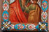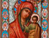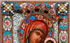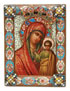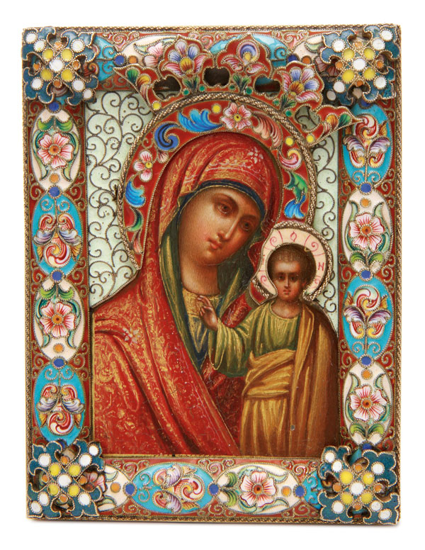 A RUSSIAN ICON OF THE KAZAN MOTHER OF GOD, FEODOR RUCKERT, MOSCOW, 1899-1908. A finely painted image of the Kazan Mother of God with minute ornate gilt-highlights executed on metal and overlaid with an exceptional silver-gilt and shaded enamel riza. The halo with floral scrolls on a maroon ground, the background in mint green. The borders with shaded vari-colored enamel floral decorated ovals and at each corner a cross with multi-colored cloisonné enamel beading. Hallmarked on the lower edge, Moscow, circa 1899-1908 and Cyrillic maker's mark ФР for Feodor Rückert and 88 silver standard. The verso backed in maroon velvet and mounted with silver hanging device. 3.6 inches x 2.7 inches (9.2 x 6.8 cm).