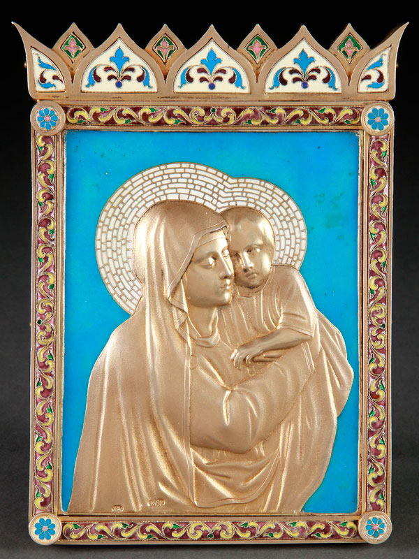 AN EXQUISITE AND UNIQUE RUSSIAN ICON OF THE TENDERNESS MOTHER OF GOD, 1896-1905. At center the Mother of God holding the infant Christ in a tender (umeliene) cheek-to-cheek embrace. Executed in high relief repoussé gilded silver, their haloes in white champlevé enameled in simulated mosaic on a semi-transparent turquoise blue enamel field. The outer border of the frame set with stylized rosettes in each corner and the borders enameled in scrolling foliage on a purple translucent enamel ground. The upper border surmounted by a row of ogee-shaped arches with floral elements on a cream enameled field. The verso with finely finished wood backing incorporating a precision made recessed strut support. Hallmarked Kostroma, circa 1899-1905, Cyrillic maker's mark Kh.M. and 84 silver standard. Spectacular! 6.5 inches x 4.9 inches (16.5 x 12.5 cm).