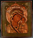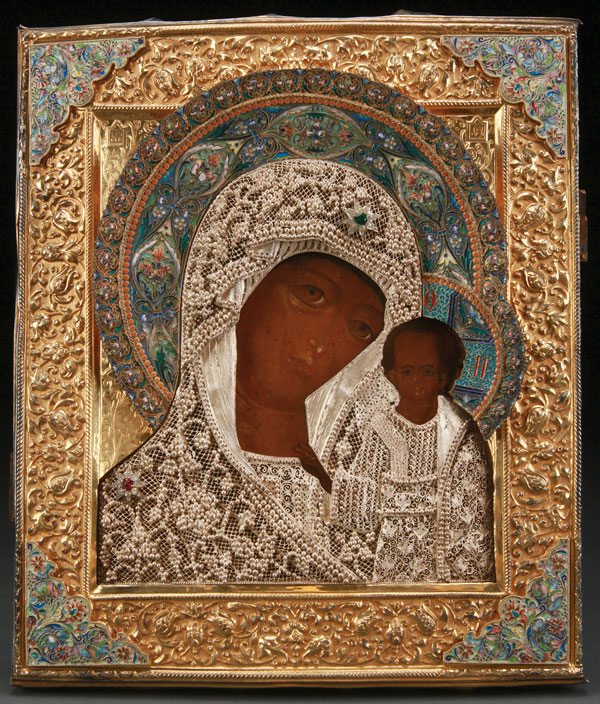A VERY FINE RUSSIAN ICON OF THE KAZAN MOTHER OF GOD, 17TH CENTURY. A good 17th century icon no doubt modeled after the original wonderworking Kazan image as indicated by the elaborate painted halo of the type known to have once embellished the famous Mother of God image which was discovered in the late 16th century in the village of Kazan. The verso of icon with original partial inscription in Old Church Slavonic, “In front of this holy image prayed the servant of God Peter son of Andreas…” The entire image overlaid with an exceptional gilded silver, repoussé and chased riza with elaborate shaded enamel halo and corners, as well as silver filigree overlaying the vestments. Hallmarked Moscow, 1908-1917, and Cyrillic makers mark of Yakov Feodorovich Mishukov, and 84 standard. Stunning! 12.75 inches x 11 inches (32.5 cm x 27.5 cm).