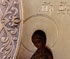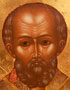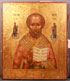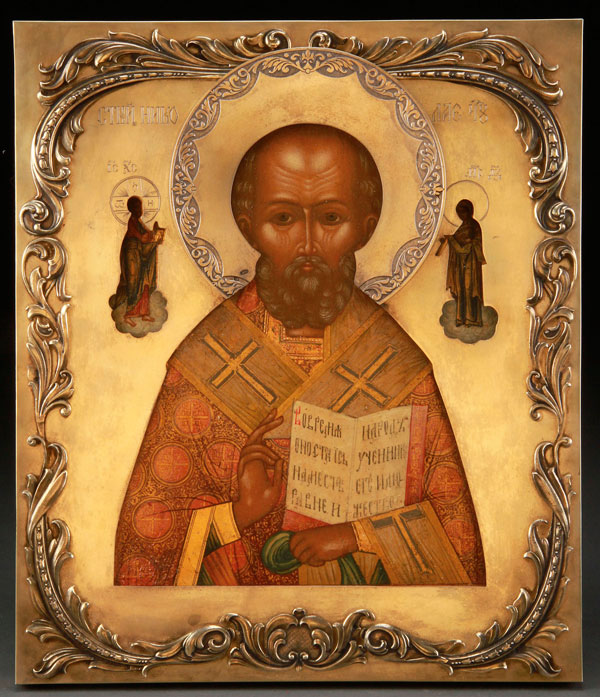 A RUSSIAN ICON OF ST. NICHOLAS, MOSCOW, CIRCA 1900. Overlaid with a silver-gilt Art Nouveau style riza (possibly later) with applied scrolling foliage decorated with bell flowers and the halo similarly chased. Hallmarked for Moscow, circa 1908-1917, Cyrillic maker's mark DS possibly for Dmitri Smirnov. 12.3 inches x 10.5 inches (31.5 x 27 cm).