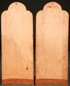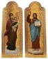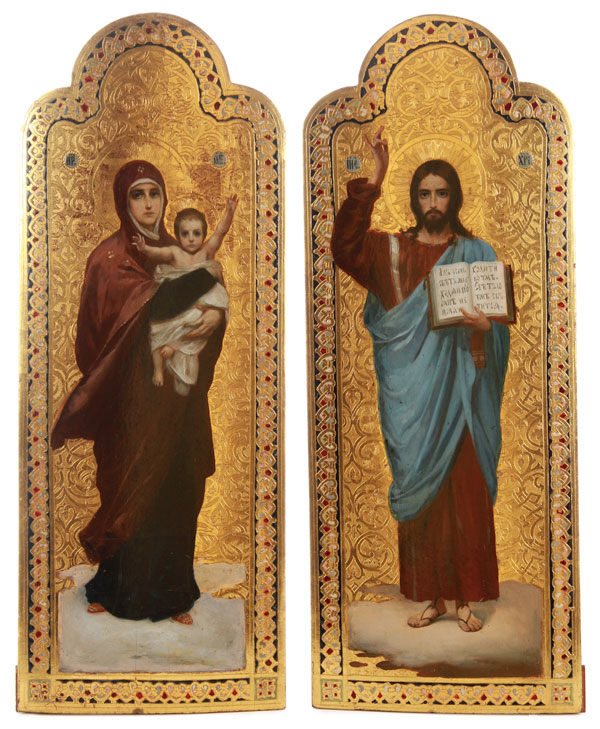 A PAIR OF RUSSIAN ICONS, THE MOTHER OF GOD AND CHRIST, AFTER NESTEROV, CIRCA 1890. These icons repeat the fresco compositions of the Mother of God (located over the altar in the central apse) and Christ icon in the Cathedral of Saint Vladimir, in Kiev, Ukraine. On the left the Mother of God holds the infant Christ and on the right the adult Christ delivers a blessing and holds a book of open Gospels inscribed with the text from John 8:12, “I am the Light of the World…” The backgrounds ornately incised and the borders decorated in faux enameling. 16 inches x 6.25 inches (40.6 x 15.9cm).