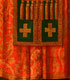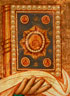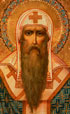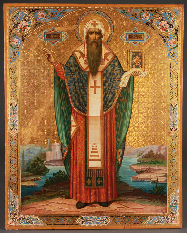 A LARGE AND IMPRESSIVE ICON OF SAINT MICHAEL METROPOLITAN OF KIEV, MOSCOW, CIRCA 1892. At center, a full length image of St. Michael, vested wearing a bishop's omophorion and patriarch's koukoulion holding a book of gospels in his left hand, and with his right hand raised in blessing. The gilded background in arched reserve and ornately incised with repeating cross pattern, the borders intricately decorated in faux cloisonné enameling, the highly stylized landscape with water follows closely the same form as often found on icons from the Moscow workshop of Mstera trained iconographer Mikhail Ivanovich Dikarev. It seems likely that this icon was produced to commemorate the 900th anniversary of the death of St. Michael, who died in Kiev in the year 992. Exquisite. 35.5 inches x 28 inches (90 x 71.2 cm).