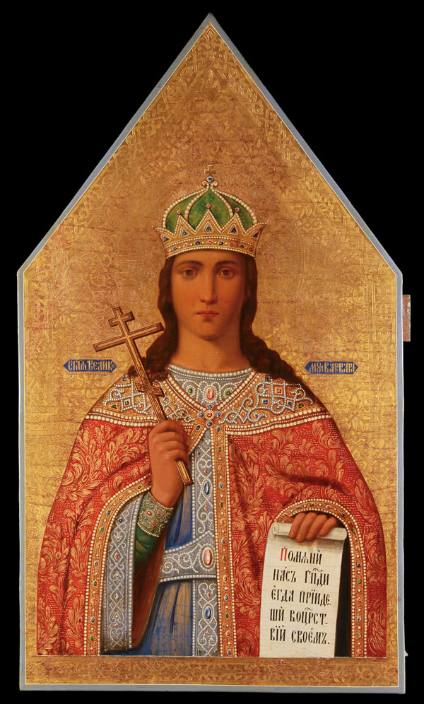A LARGE AND IMPRESSIVE ICON OF SAINT BARBARA, ATTRIBUTED TO THE WORKSHOP OF VASILY PESHEKHONOV, CIRCA 1860. The half length image depicting St. Barbara wearing royal robes and a crown, embellished with pearls and gemstones and with gilt shading, all typical Peshekhonov hallmarks. She holds a martyrs cross with her right hand and with her left a scroll upon which is inscribed with a variation on Luke 23:42, the words of the repentant thief "Remember us Lord when you come into your kingdom." Her name is inscribed in gilt lettering within blue rectangle cartouches and identify her as the Holy Great Martyr Barbara. The gilded background and borders intricately incised with strapwork, similar to other known Peshekhonov examples, the same as the previous lot and which was also probably once part of the same Iconostasis. 36.75 inches x 20.75 inches (93.3 x 52.6 cm).