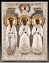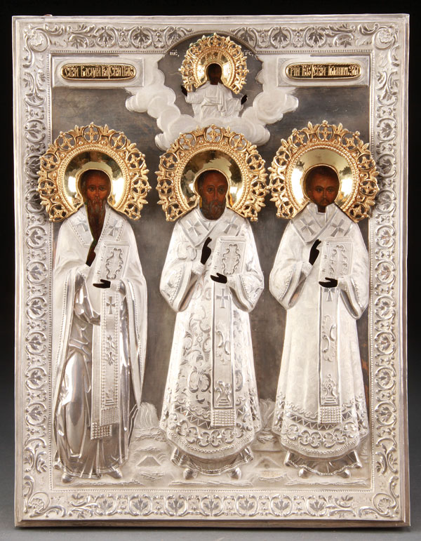 A RUSSIAN ICON OF THE THREE HIERARCHS. This icon depicts the saints Basil the Great of Caesara, Gregory the Theologian of Nazianzus, and John Chrysostom, “The Golden Mouthed.” The entire image overlaid with an ornate silver repoussé and chased riza with applied gilded halos and title plaques, hallmarked St. Petersburg, dated 1847, Cyrillic maker’s mark LA and 84 silver standard. The painted icon panel being of a later period (20th century). 13.6 inches x 10.5 inches (34.6 x 27 cm).