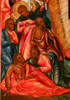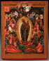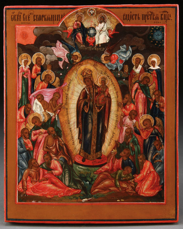 A FINE RUSSIAN ICON OF THE JOY TO ALL WHO SUFFER MOTHER OF GOD, 19TH CENTURY. At center the Virgin and Christ child surrounded by suffering humans attended by angels. At top center, the New Testament Trinity. Verso with exhibition label of Hammer Galleries, New York, dated August 1937. 10.5 inches x 8.75 inches (26.6 x 21.8 cm).