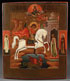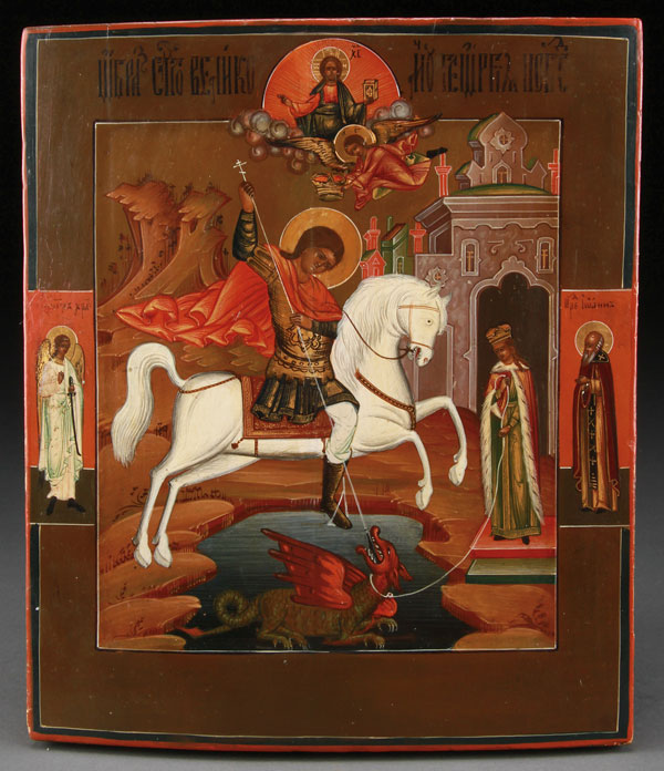 A RUSSIAN ICON OF SAINT GEORGE, 19TH CENTURY. At center, George atop a white steed plunges his lance into the dragon beneath him, tethered by a leash held by the Princess Elisaba, so that the beast may be led through the town for the conversion by the people, before it was finally killed. Above George, an angel descends to place a martyrs crown upon his head, and above further still, Christ in an arched reserve delivers a blessing. The left border with the guardian angel, and the right border with the venerable St. John. The upper margin inscribed with a condensed and abbreviated title, identifying the subject as The Holy Great Martyr George the Victorious. 12.1 inches x 10.25 inches (31 x 26.2 cm).