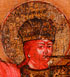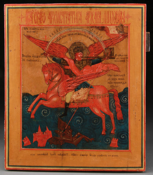 A RUSSIAN ICON OF THE ARCHANGEL MICHAEL, 18TH CENTURY. A large and colorful rendering depicting Michael as the chief captain of the heavenly armies, crowned and riding upon a winged horse, a rainbow extends over his head. A lance is in one hand and a censer and book in the other, a long horn extends from his mouth. He is shown here defeating Satan, who has fallen at the base beside tumbled buildings in an abyss. At upper right, Christ Emmanuel before the Hetimasia, the prepared altar which is also the symbolic throne of Christ. The upper margin inscribed in red, with the title for this icon identifying him as "The image of the Holy Arkhistrategos Archangel Michael." 17.1 inches 14.6 inches (43.5 x 37 cm).