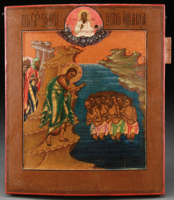 A RUSSIAN ICON OF THE ASSEMBLY OF THE HOLY JOHN THE FORERUNNER. At center, John is depicted with a crowd assembled in the Jordan river for baptism by him. Looking on from the rear left are the Sanhedrin and Pharisees. At top center, God the Father delivers a blessing within an arched reserve. The upper margin inscribed "The image of the assembly of the Holy John the Forerunner." 12.5 inches x 10.5 inches (31.5 x 26.5 cm)