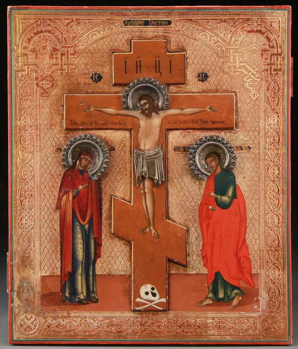 A RUSSIAN ICON OF THE CRUCIFIXION, 19TH CENTURY. At center an inset blessing cross flanked by the Mother of God on the left and the Apostle John on the right. The head of each figure encircled with a silver-gilt repoussé and chased halo and the loincloth of Christ also overlaid in silver. 17.5 inches x 14.75 inches (44.5 x 37.4 cm).