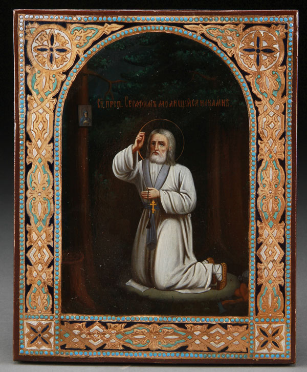 A FINE RUSSIAN ICON OF SAINT SERAPHIM OF SAROV, CIRCA 1903. Here Seraphim is seen kneeling in prayer within a forest clearing upon a rock. He wears a cast bronze crucifix around his neck, holds a lestovka and blesses himself before his beloved icon of the Mother of God (His Joy of Joys) which hangs in the tree above him. At his feet a hat, bread sack, gloves and axe. The borders ornately incised and painted to simulate enamel. The inscription above his head identifies him as The Holy Venerable Seraphim Praying on His Stone. 8.75 inches x 7 inches (22.2 x 18 cm).