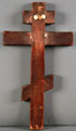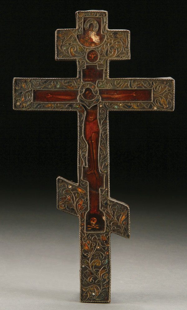 A RUSSIAN BLESSING CROSS, 19TH CENTURY. Overlaid with enameled riza and in an original state of preservation. 11.3 inches x 6.3 inches (29 x 16.2 cm).