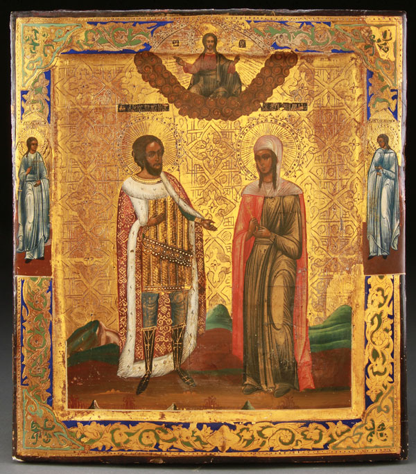 A RUSSIAN ICON OF SAINT ALEXANDER NEVSKY AND ZINAIDA, 19TH CENTURY. At top center, Christ delivers a blessing and the borders with the Guardian Angels. 14 inches x 12.25 inches (35.5 x 31.2 cm).