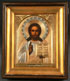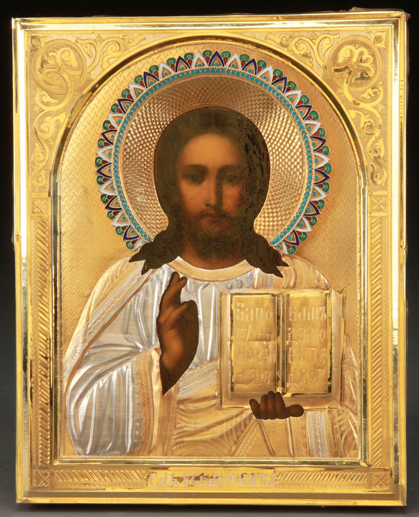 A RUSSIAN ICON OF CHRIST THE LORD ALMIGHTY. Naturalistically rendered and overlaid with a silver-gilt machine engraved riza with cloisonné enameled halo. Hallmarked Moscow circa 1899-1908, Cyrillic maker's mark N.N. and 84 silver standard. Together with a vintage glazed shadowbox frame (kiot) with gilt liner (not shown). 8.75 inches x 7.1 inches (22.5 x 18 cm).