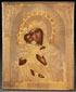 A RUSSIAN ICON OF THE VLADIMIR MOTHER OF GOD. Naturalistically rendered and overlaid with an ornate silver-gilt machine engraved riza. Hallmarked Moscow, dated 1869, Cyrillic maker's mark PK and 84 silver standard. 10.6 inches x 8.6 inches (27 x 22 cm).