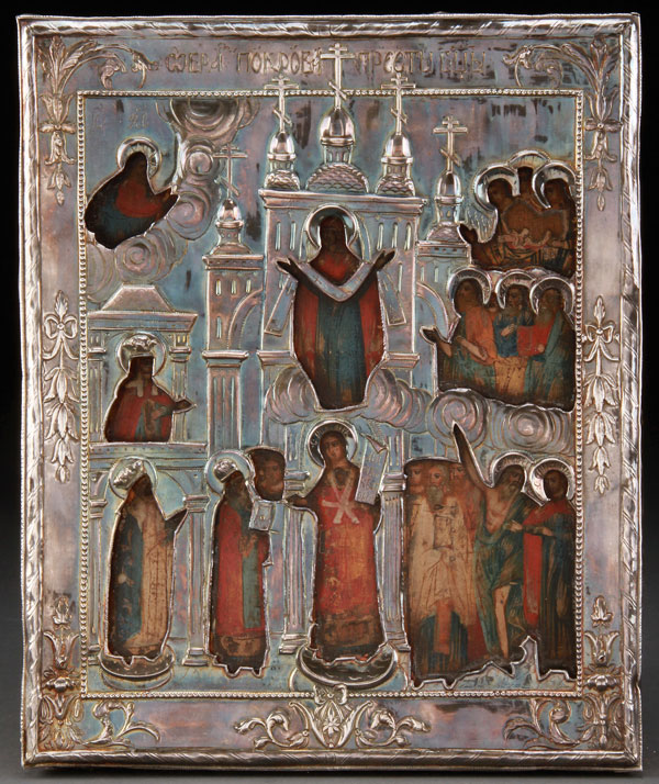 A RUSSIAN ICON OF THE POKROV MOTHER OF GOD, END OF THE 18TH CENTURY. Overlaid with a heavy silver repoussé and chased riza. Hallmarked St. Petersburg, dated 1800, Cyrillic maker's mark SA.P and 84 silver standard. 12.1 inches x 10 inches (31 x 25.5 cm).