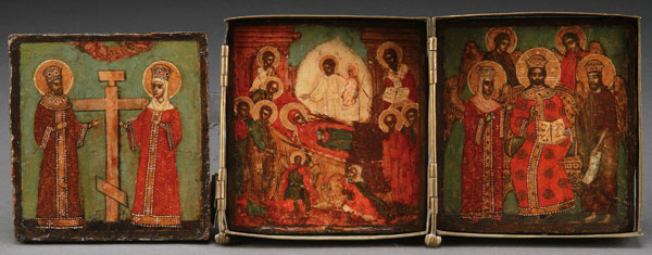 A RUSSIAN TRAVELING ICON TRIPTYCH, 18TH CENTURY. The left wing painted with the Dormition, the central panel painted with the Deisis and the right wing with Saints Constantine and Helen. Only two hinged frames intact. Open 3.3 inches x 9.3 inches (8.9 x 24 cm).