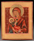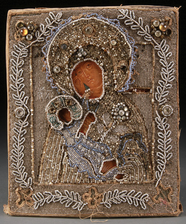 A RUSSIAN ICON OF THE SOOTHE MY SORROW MOTHER OF GOD, CIRCA 1800. Here the Mother of God with right hand raised to her head looks down upon the infant Christ who rests upon her lap and holds a scroll with words taken from Zachariah 7: 9-10. The entire image overlaid with a cloth riza profusely embellished with glass beads and paste stones. 10.5 inches x 8.9 inches (26.5 x 22.5 cm).