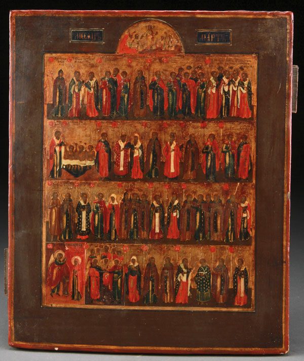 A RUSSIAN ICON FOR THE MONTH OF MARCH, 19TH CENTURY. Depicting the saints or events celebrated on each day of the Liturgical calendar for the month of March. 12.25 inches x 10.25 inches (31.2 x 26 cm). (Unillustrated).
