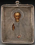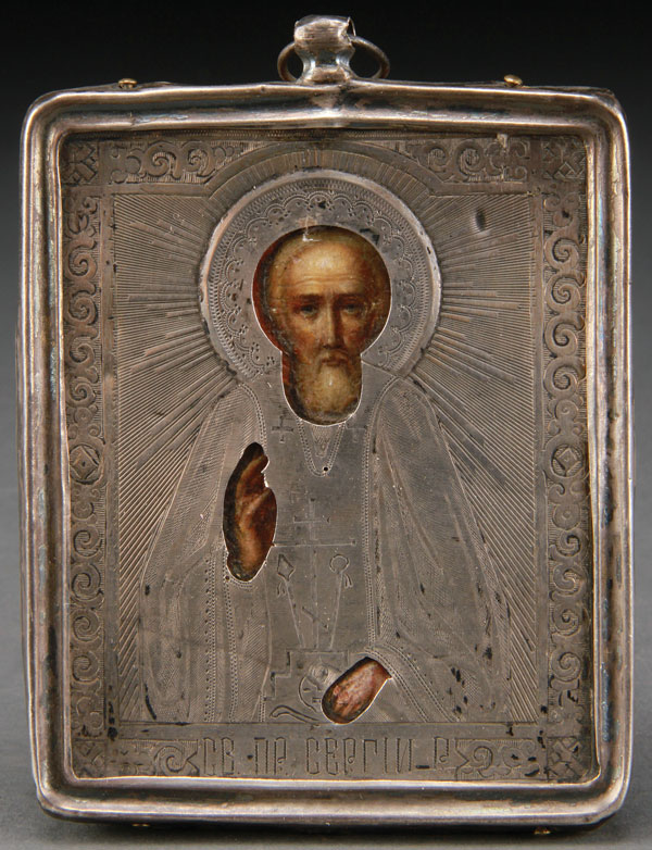 A RUSSIAN ICON OF SAINT SERGEI OF RADONEZH. Overlaid with an engraved silver riza. Hallmarked Moscow, circa 1900, Cyrillic maker's mark IS and 84 silver standard. The top of riza with integral suspension loop. 3.5 inches x 2.9 inches (9 x 7.5 cm). (Unillustrated).